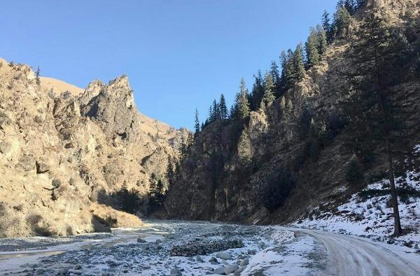 站在谷口望去,拉洞峽谷兩側(cè)山勢陡峭,整個崖壁垂直向上,直指蒼穹。峽壁上長滿了筆直的云杉,枝葉伸展,在峽谷上空架起一層巨大的頂蓋。峽谷兩側(cè)相距不足十米,一條溪流占去大半,小溪的表面已經(jīng)結(jié)冰,還保留著奔流的姿態(tài),冰層下傳來嘩嘩的流水聲。小溪旁的道路由石子鋪成,凹凸不平,路邊積滿了山頂滑落的碎石。由于河谷狹窄,陽光難以照入,谷內(nèi)溫度明顯低于谷外,地上堆滿了厚厚的積雪,車子走在上面,左右滑動,隨時可能滑出路面。才讓兄弟想帶我穿越峽谷,我有些擔(dān)心,怕車子滑進溪流,商量一下決定下次騎摩托車穿越。